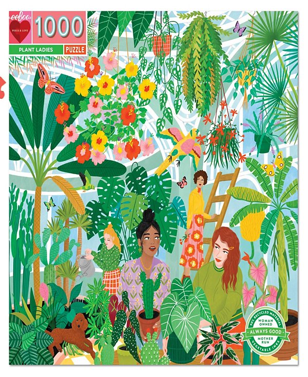 Eeboo Piece and Love Plant Ladies puzzle features a conservatory of plants and botanicals where friends meet to relax, converse and enjoy one another's company. Artist Bodil Jane celebrates coming together to nurture one another and grow.